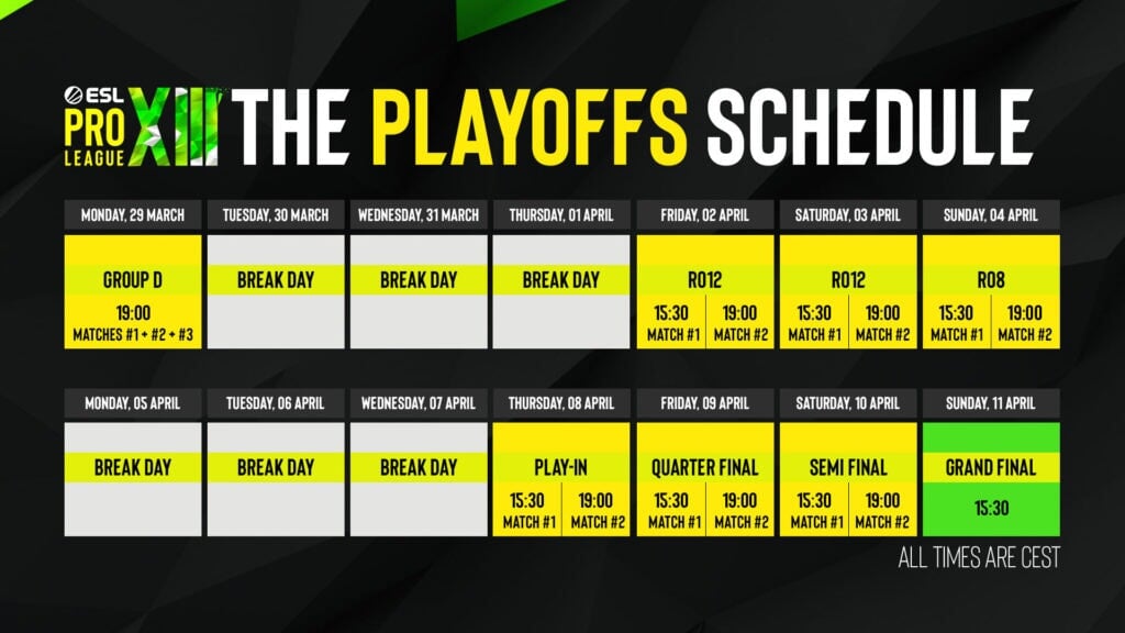 Кроме того, ESL показала расписание сетки плей-офф. В каждой турнирной неделе планируется по три “выходных”, а полуфиналы и финал назначены на один день — 11 апреля.