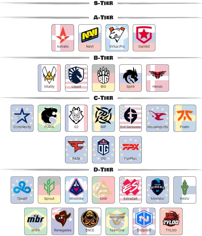 Тир D — слабо себя показывают против команд выше уровня, играют на мелких турнирах или только начали свой путь.