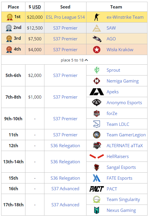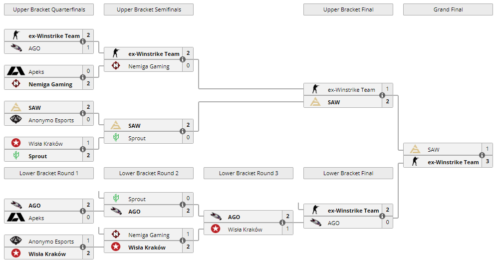 В гранд-финале ESEA Season 36: Premier Division – Europe Ex‑Winstrike оказалась сильнее sAw и закончила встречу со счетом 3:1. За победу команда получила $20,000 и слот на ESL Pro League Season 14 с призовым фондом $750,000. Белорусская команда Nemiga Gaming проиграла Ex‑Winstrike в полуфинале верхней сетки плей-офф.