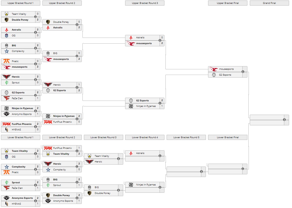 Команда G2 Esports обыграла Ninjas in Pyjamas в верхней сетке Flashpoint Season 3 по CS:GO. Матч закончился со счетом 2:1 — 12:16 на Dust2, 19:17 на Inferno и 16:14 на Mirage. Следующим соперником G2 Esports станет mousesports, а NiP продолжат борьбу в нижней сетке, где встретится с победителем пары BIG — Double Poney.