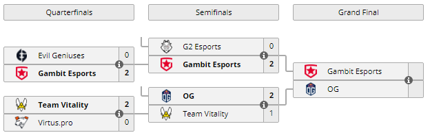 13 июня в 17:00 состоится гранд-финал IEM Summer XVI. В битве за $100 000 столкнутся Gambit и OG. Проигравший удостоится приза в $42 000. Матч пройдет в формате Bo5.
