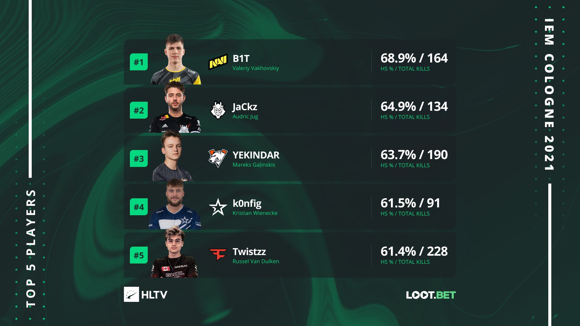 Второе место в рейтинге занял Одрик JACKZ Жюг (64,9%) из G2 Esports, а на третьей строчке расположился участник ростера Virtus.pro Марекс YEKINDAR Галинскис. В топ-5 также вошли Кристиан k0nfig Винеке и Рассел Twistzz Ван Далкен.