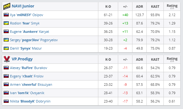 VP.Prodigy не смогли одолеть NAVI Junior. “Медведи” уступили на Dust2 (12:3; 4:3) и Overpass (11:4; 5:6). Итоговый счет 2:0 в пользу украинского коллектива.