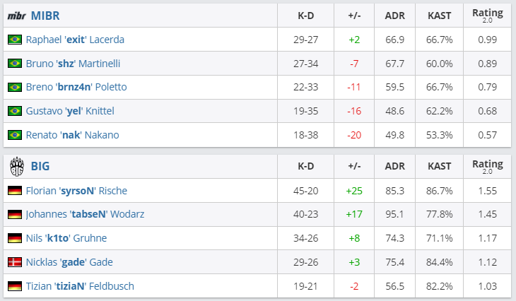 В матче группы “B” BLAST Premier: Fall Groups 2021 BIG со счетом 2:0 обыграла бразильскую команду MIBR. Результат первой карты (Mirage) — 16:4, второй (Nuke) — 16:9. Немецкий коллектив 22 сентября в 17.30 сыграет с G2 за выход в гранд-финал группы и слот на Fall Finals.
