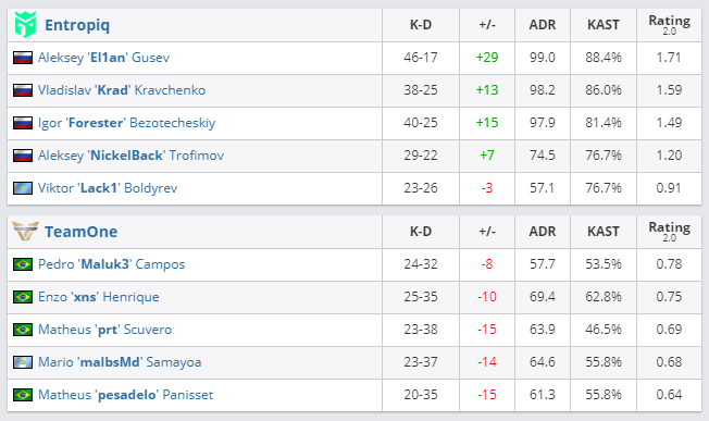 На Mirage Team oNe уступала в первой половине 9:6. Коллективу не удалось даже сократить разрыв. Карта закончилась со счетом 16:6 в пользу Entropiq. На Dust2 ситуация повторилась с разницей в очко. Как итог — 16:5. Счет в матче — 2:0.