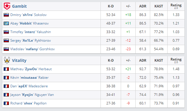Vitality встретилась с Gambit в матче группового этапа ESL Pro League Season 14. Коллективы сыграли на двух картах.