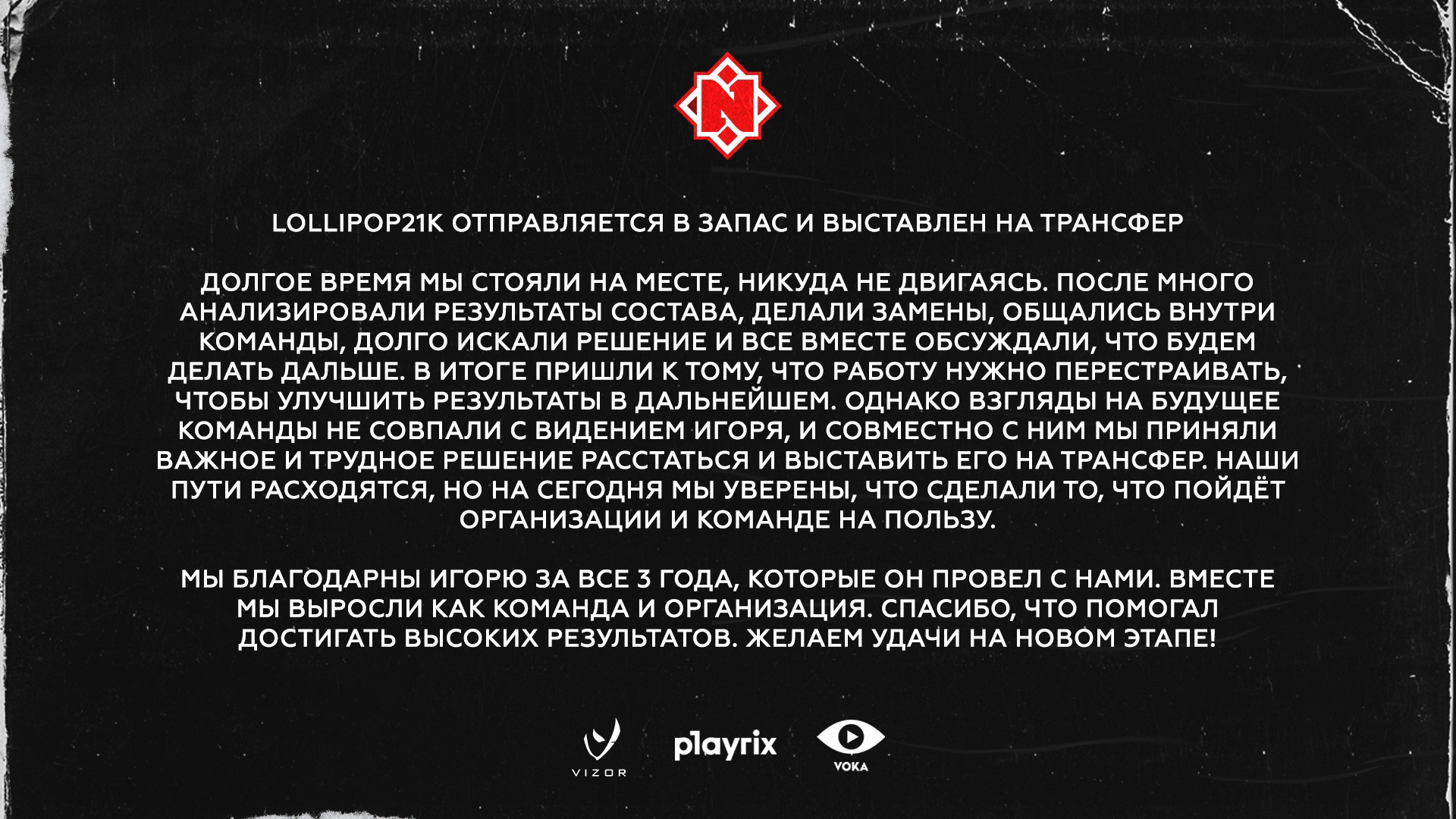 31 октября белорусский профессиональный игрок в CS:GO Игорь lollipop21k Солодков на своей официальной странице во ВКонтакте сообщил, что покинет Nemiga Gaming. Чуть позже в социальных сетях клуба появилось официальное заявление.