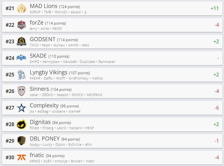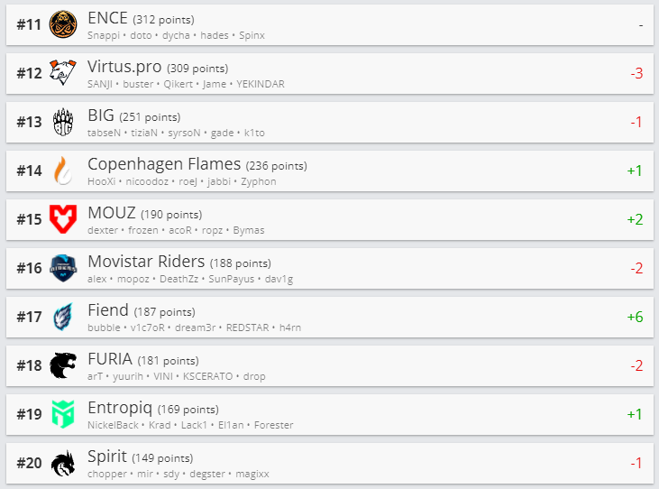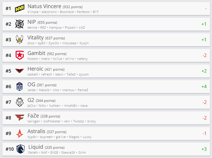 Традиционно в начале недели ресурс HLTV.org обновил рейтинг лучших команд мира в CS:GO. По-прежнему лидерство удерживает Natus Vincere, а вот Gambit Esports опустилась на две строчки, пропустив в топ-3 Ninjas in Pyjamas и Team Vitality. Белорусская Nemiga Gaming потеряла две позиции и расположилась на 38-ом месте рейтинга.