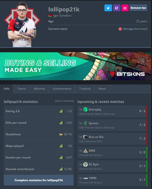 Бывший игрок состава Nemiga Gaming по CS:GO Игорь lollipop21k Солодков на своей официальной странице во ВКонтакте подвел итоги уходящего года: