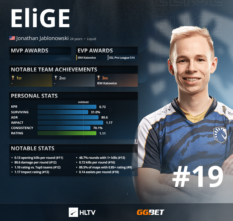 Джонатан EliGE Яблоновски из команды Team Liquid занял 19-е место в рейтинге лучших игроков 2021 года по версии портала HLTV.org. Это его пятое попадание в список за карьеру.