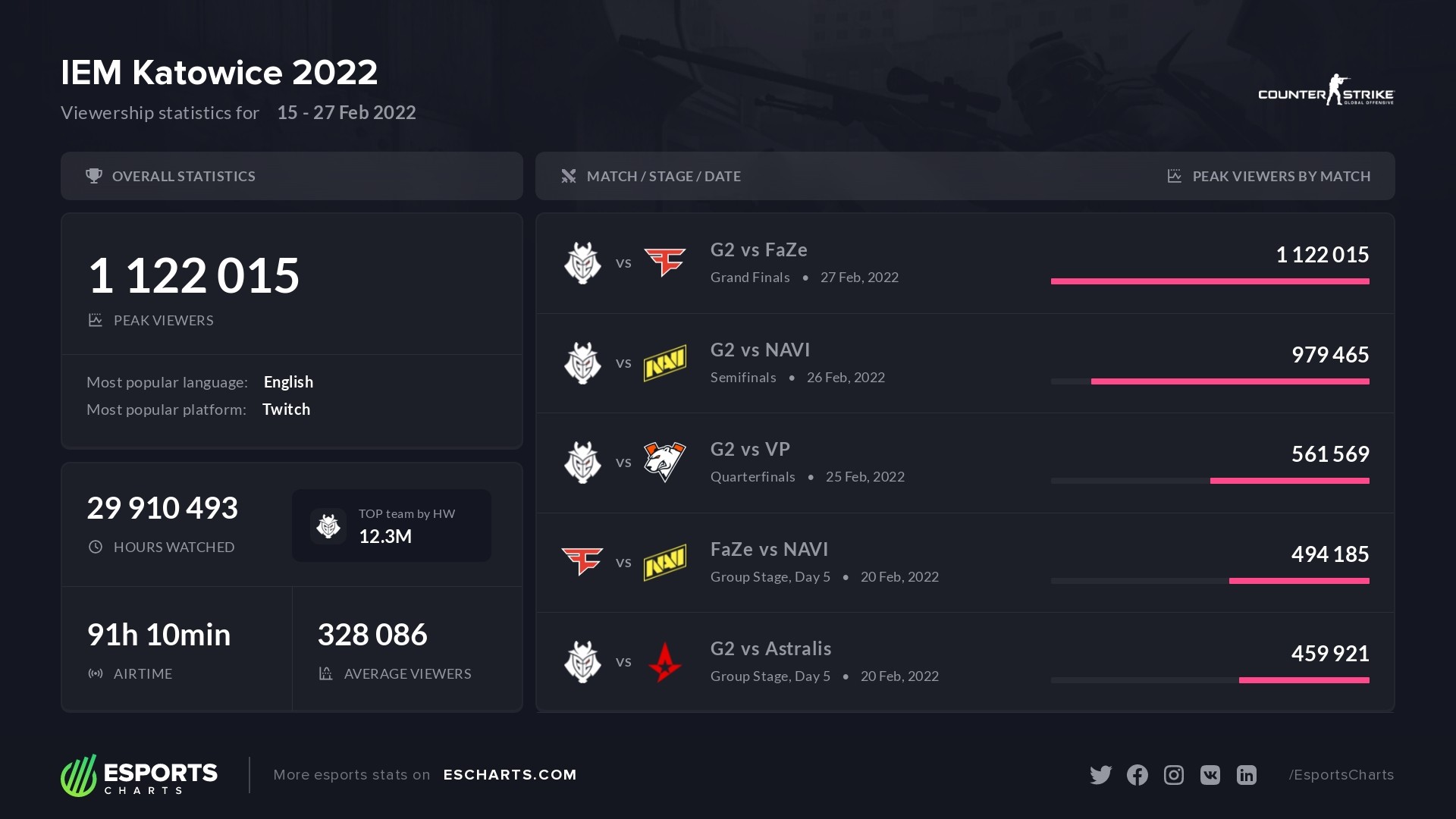 Гранд-финал IEM Katowice 2022 в пике собрал 1,1 млн человек. Такую информацию предоставил портал Esports Charts. Это пятый матч по популярности в истории CS:GO.