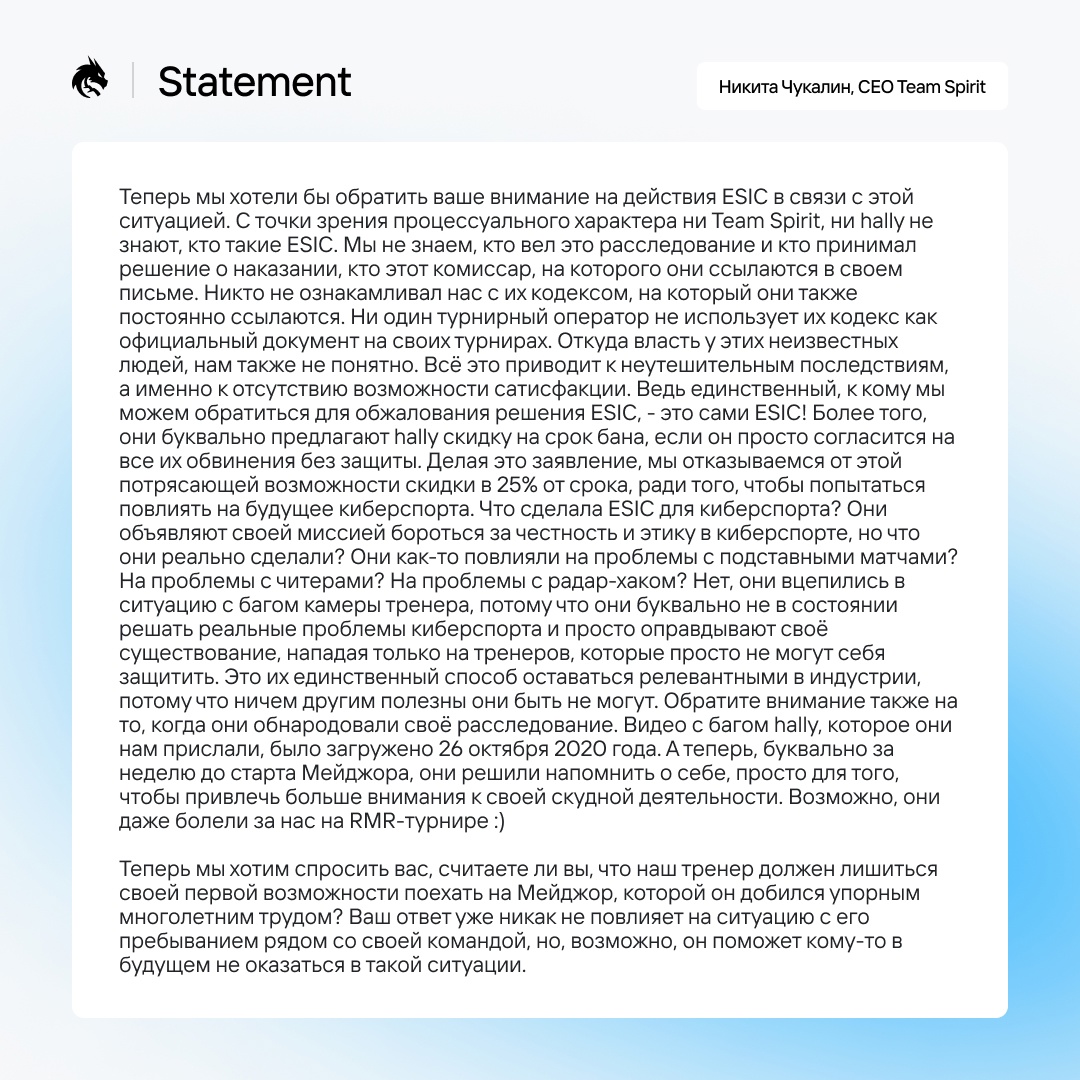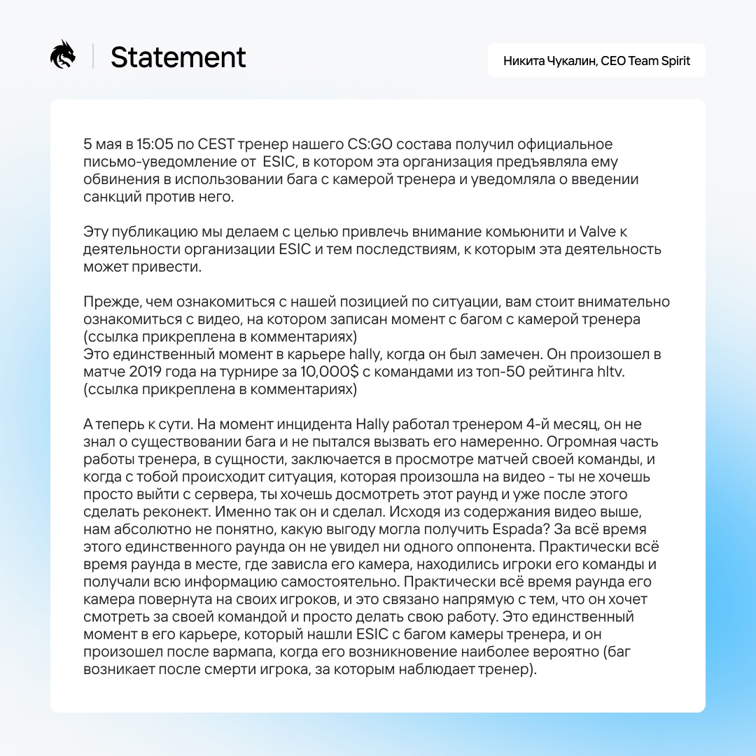 Тренер CS:GO состава Team Spirit Сергей hally Шаваев отстранен от участия в PGL Major Antwerp 2022. Рулевой “драконов” попал под мини-волну банов от организации ESIC из-за пресловутого бага с камерой.