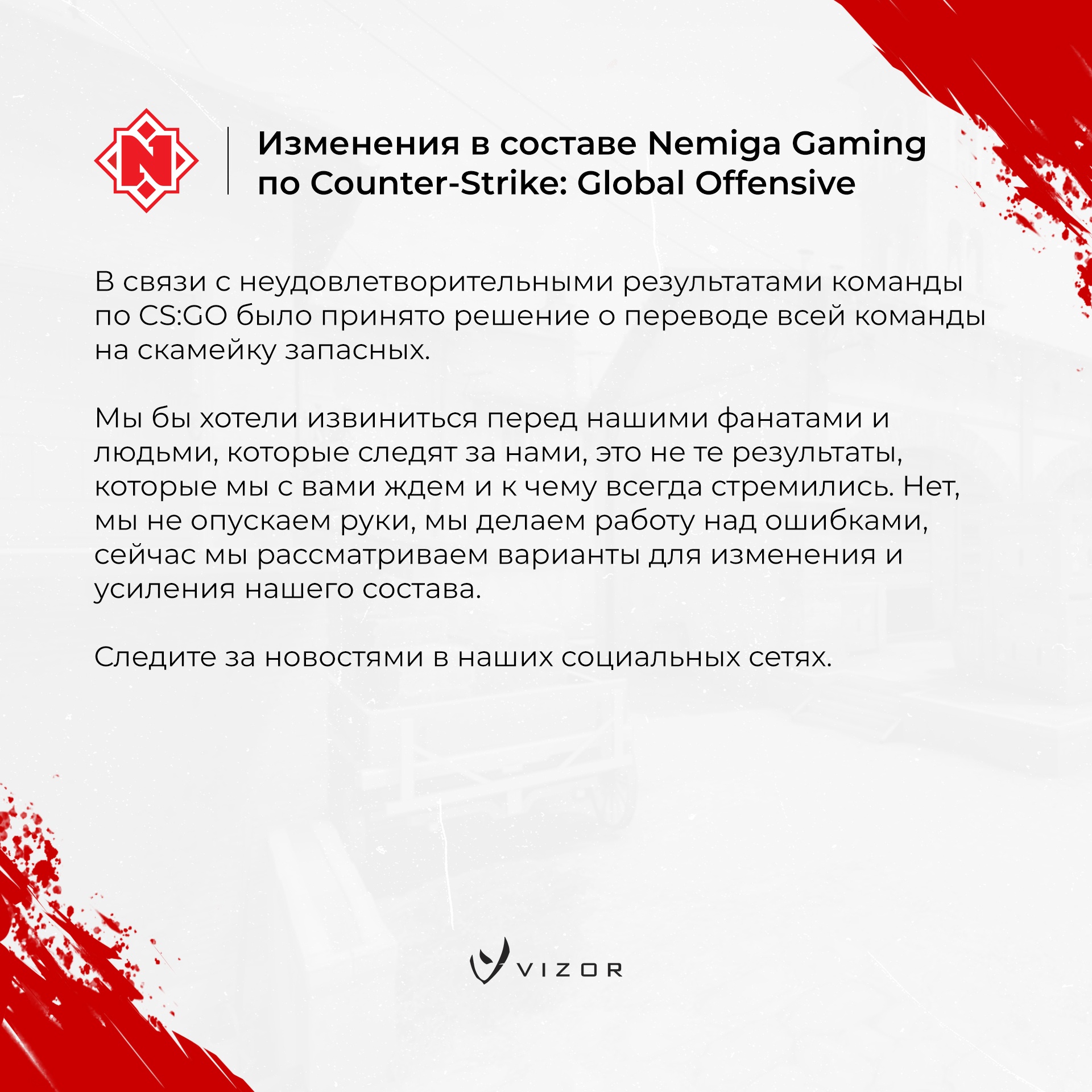 Nemiga перевела весь ростер по CS:GO на скамейку запасных. Об этом белорусская организация сообщила в своих соцсетях. По словам Nemiga, причиной перевода состава на скамейку запасных стали неудовлетворительные результаты коллектива.