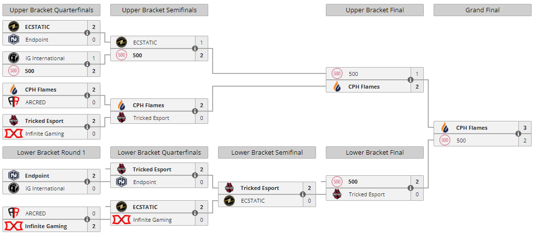 В гранд-финале Global Offensive Champions League Season 3 датский коллектив Copenhagen Flames со счетом 3:2 обыграл болгарскую команду 500 и выиграл $25 000. Серебряным призерам досталось $12 500.