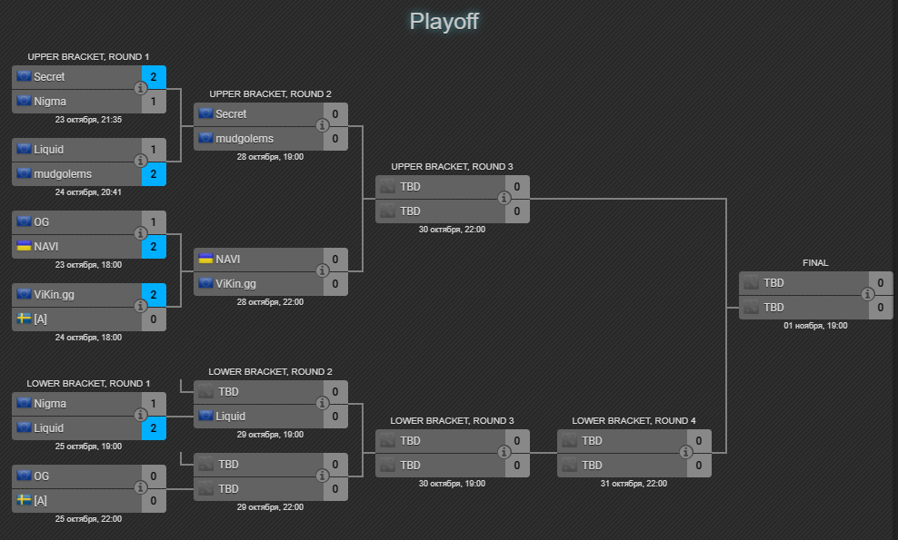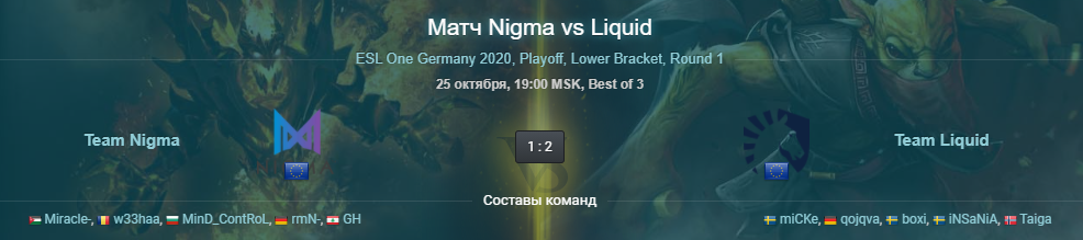 Team Liquid победили Team Nigma в матче плей-офф нижней сетки ESL One Germany 2020. Встреча закончилась со счетом 2:1. Liquid выбили своего оппонента с турнира и прошли дальше по сетке, следующий матч назначен на 29 октября в 19:00.