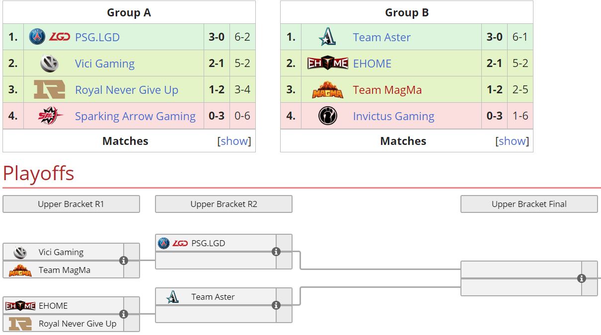 Таким образом, и та, и другая команды продолжат борьбу в плей-офф, однако EHOME это сделает с более высокого, второго, места. Она встретится с Royal Never Give Up, которые в параллельном квартете заняли третью позицию. Что касается Team MagMa, то она будет соперничать с Vici Gaming.