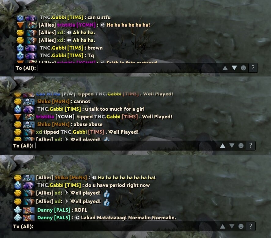 “Только что играла в ранговую игру, в которой игрок TNC Gabbi заявил, что я говорю слишком много для девушки. У девушек теперь нет прав на разговоры в игре? Лол”, – написала она в твиттере и выложили скриншоты переписки из игры.