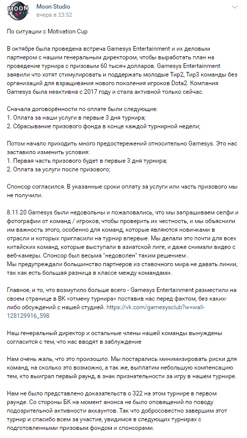 Турнирный оператор Moon Studio объявил о досрочном завершении Motivation Cup. На такой шаг пришлось решиться из-за конфликта со спонсорами. Информацию об отмене студия разместила на своей официальной странице в VK.