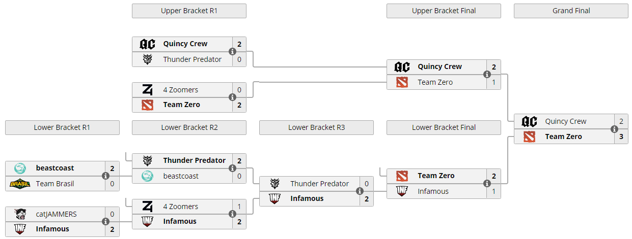 В финале DOTA Summit 13 Online Американского региона со счетом 3:2 команда Team Zero переиграла Quincy Crew. Оба коллектива начали плей-офф с верхней сетки стадии плей-офф.
