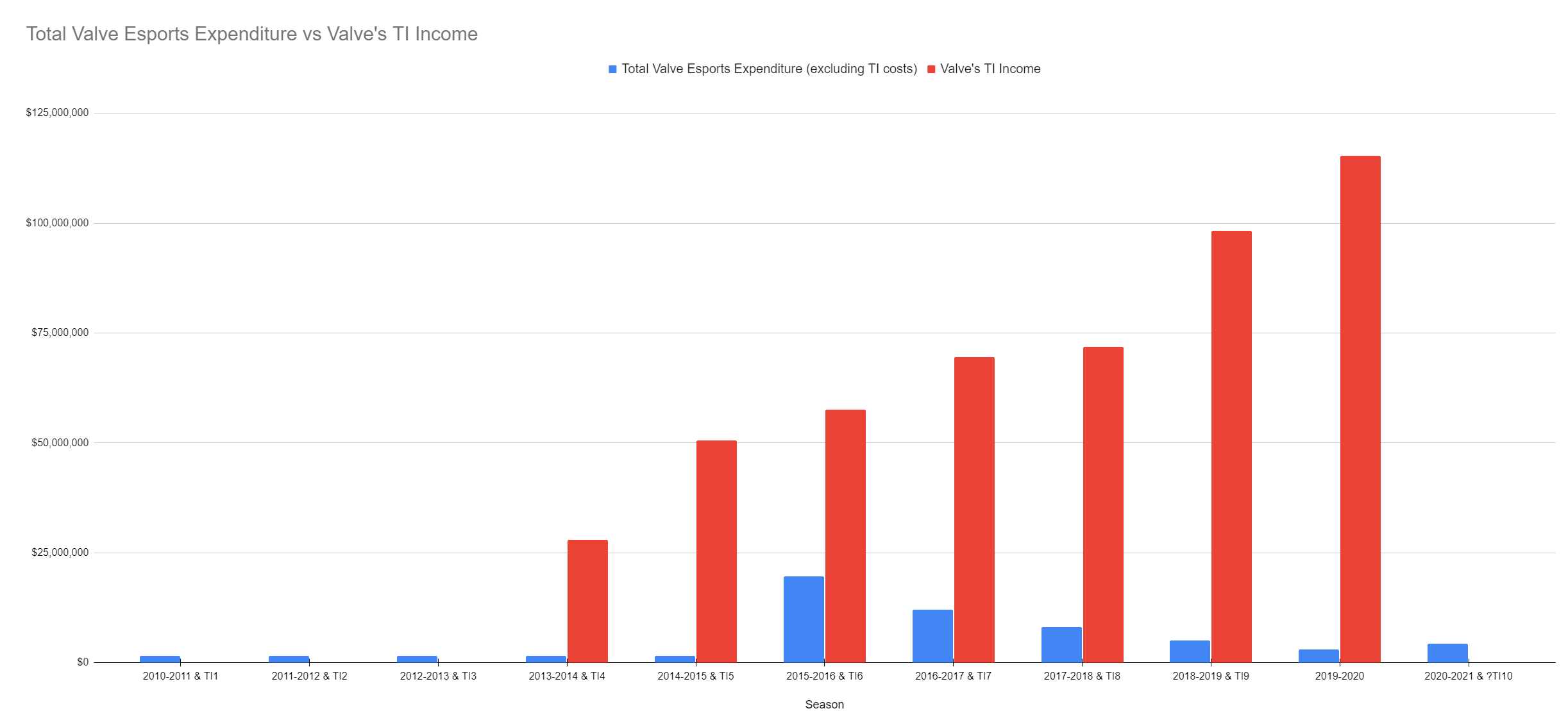 Аналитик Бен Noxville Стинуизен привел в твиттере примерные траты Valve на организацию и проведение турниров по Dota 2. Больше всего компания потратила в 2015-2016 году. Почти 10 млн $ ушло на призовые для мейджоров, и примерно такая же сумма на их организацию. В следующем сезоне расходы компании киберспортивные мероприятия сократились почт вдвое.