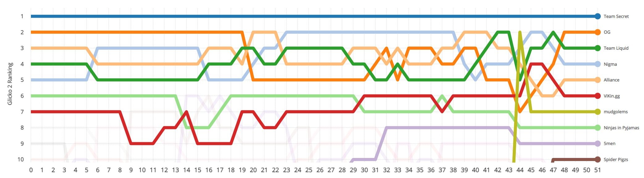 В топ-5 также попали OG, Team Liquid, Nigma и Alliance. На графике едва заметными линиями отмечены также команды, не попавшие в топ-10: Singularity, OG Seed, Aggressive Mode и немного Ad Finem.