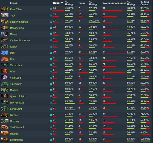 Наибольший винрейт среди героев с более чем семью играми у Nyx Assassin и Earth Spirit — они выиграли в 85,71% карт. На третьем месте расположились Batrider, Undying и Troll Warlord — их процент побед составил 71,43%. В топ также вошли Tusk (69,23%), Lina (66,67%) и Terrorblade (66,67%).