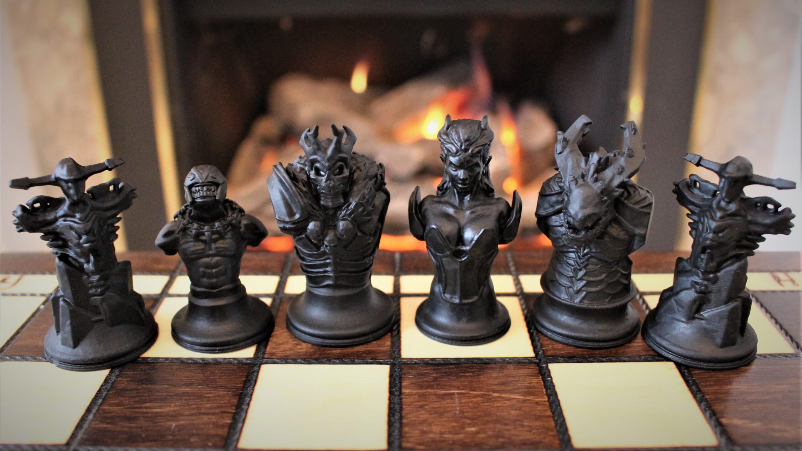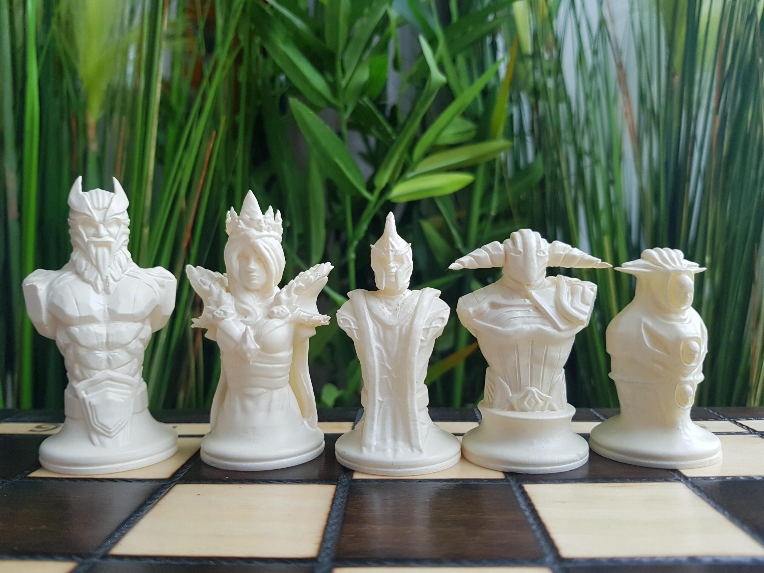 Ранее были изготовлены фигуры черных шахмат в виде башни стороны Dire, а также героев Bloodseeker, Underlord, Wraith King и Queen of Pain.