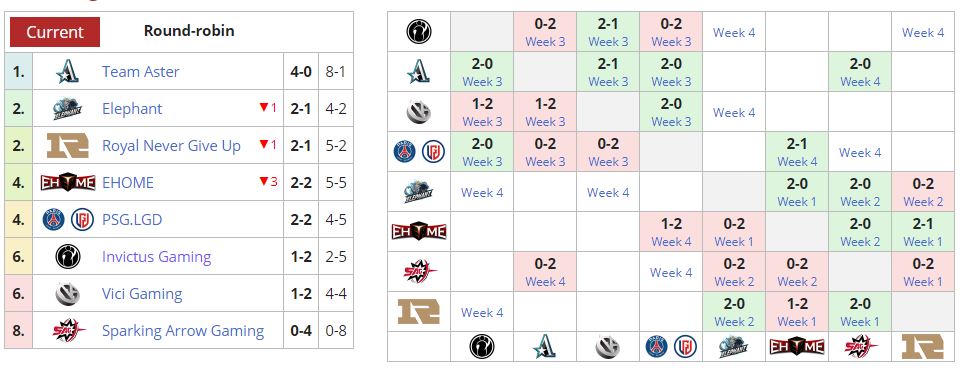4 мая завершились два матча высшего дивизиона китайской DPC-лиги. Aster уверенно обыграла главного аутсайдера турнира Sparking Arrow Gaming со счетом 2:0 и закрепилась на первой строчке в таблице. Пока команда идет по дистанции без поражений (4 победы в 4 матчах). Также подъем начала неважно стартовавшая команда PSG.LGD. Ame и компания оказались сильнее EHOME (2:1).