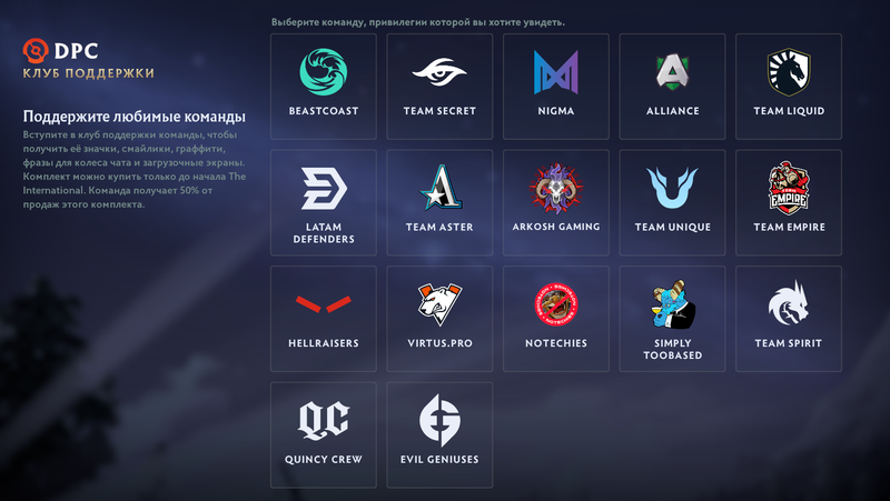 Клубам достанется 50% выручки с продажи бандлов. Текущий контент будет доступен в магазине до старта The International, далее продажи наборов будут длиться до начала каждого из мейджоров.