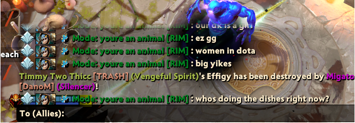 Ведущая и журналистка Лиа Reinessa Блэйк выложила скрины из игры с неуважительным обращением к женскому комьюнити. В частности на фото видно, как реагируют на нее тиммейты: “Наш дк — женщина-инвалид”, “Это не имеет никакого отношения к тому, что ты женщина, ты просто инвалид”, “наш dk — девушка, ez gg”, “кто моет посуду?”.