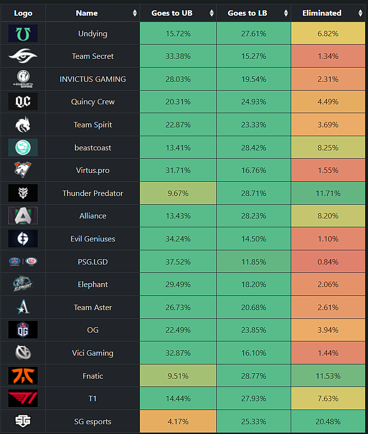 Статистик Бен Noxville Стинхейзен в своем Twitter-аккаунте опубликовал расчеты по результатам групповой стадии The International 10. По его данным, самые большие шансы выйти в верхнюю сетку плей-офф у PSG.LGD, Evil Geniuses, Team Secret, Vici Gaming и Virtus.Pro. У команы Alliance, за которую играет белорус Артем fng Баршак, шансы намного меньше — чуть более 13%.
