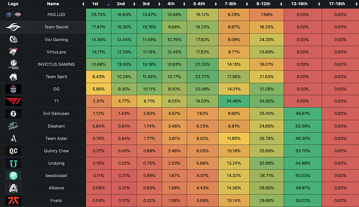 После завершения группового этапа The International 10 аналитик Бен Noxville Стинуизен посчитал вероятность команд на победу в турнире. По его мнению, самые большие шансы остаются у PSG.LGD — 25,73%. А у Alliance с белорусом fng вероятность такого расклада ничтожно мала.