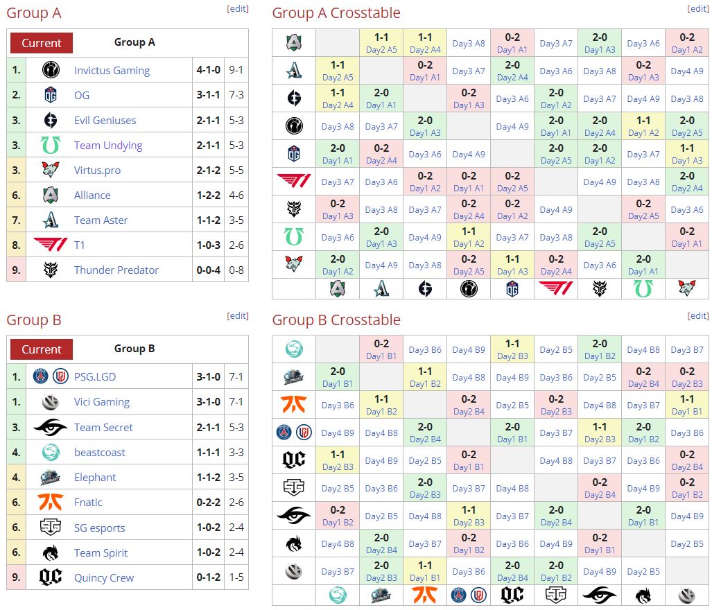 Групповой этап TI продлится до 10 октября. По его итогам две команды (худшая в каждой группе) покинут турнир. По четыре лучших коллектива из каждой группы получат путевки в верхнюю сетку плей-офф. Остальные попадут в нижнюю.