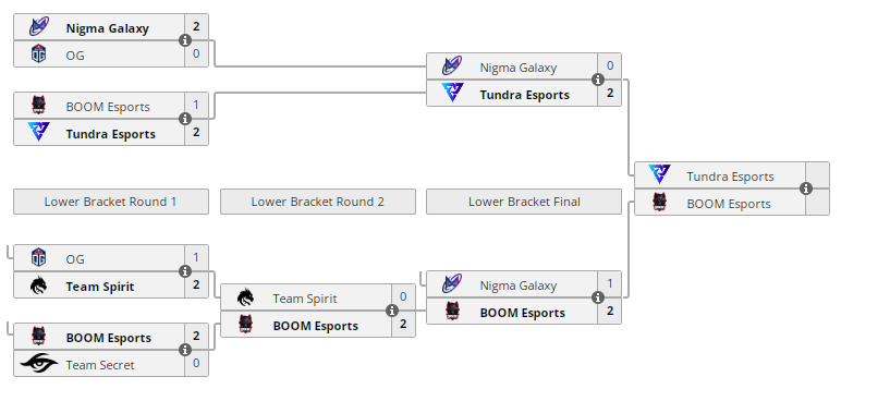 BOOM Esports прошла в гранд-финал, где сегодня сыграет с Tundra Esports. Nigma Galaxy покинула турнир, заняв 3 место и заработав $32 704.