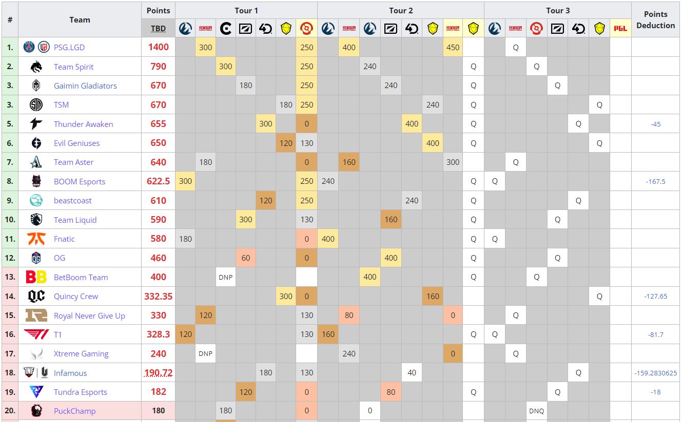 PSG.LGD вырвался на первое место по очкам Dota Pro Circuit 2021/2022. В активе китайского коллектива теперь 1400 очков. Вторым в списке идет Team Spirit с 790 баллами в активе. Gaimin Gladiators и TSM делят третью строчку (670).