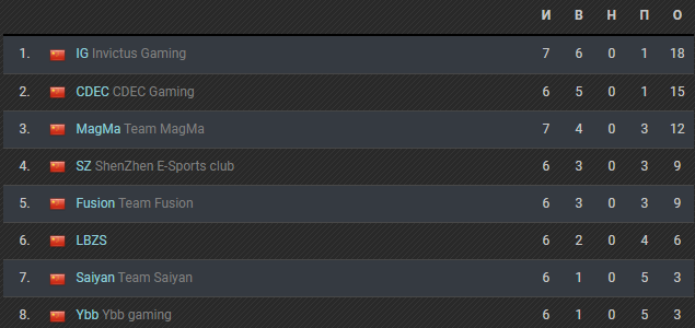Несмотря на то, что CDEC Gaming ещё остался матч с Team Fusioun, она гарантированно занимает 2-ое место в дивизионе. Invictus Gaming со своими 18 очками также проходит без сомнений.