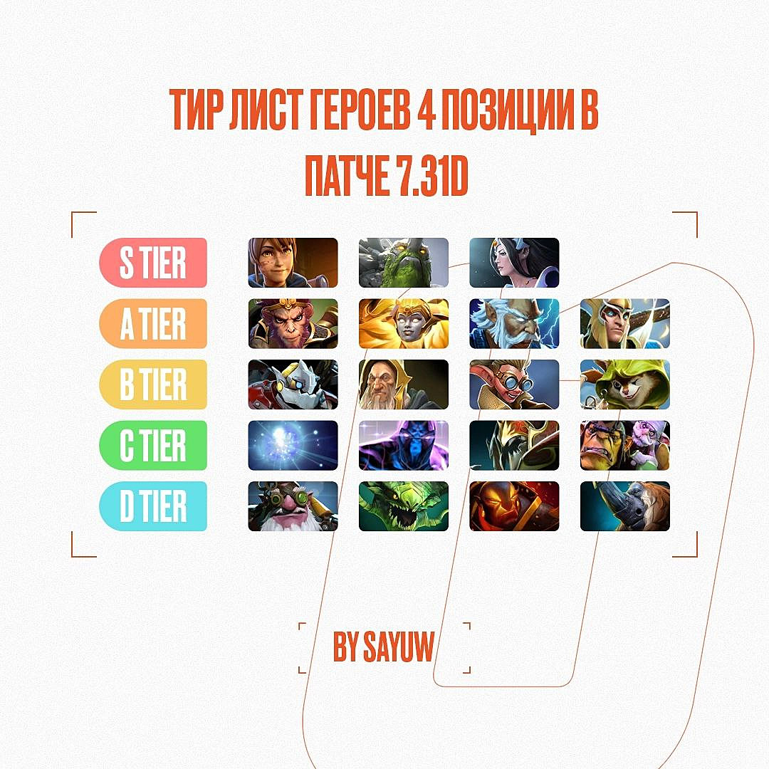 Игрок One Move Олег sayuw Каленбет составил тир-лист саппортов патча 7.31d. По словам россиянина, лучшими героями пятой позиции являются Mirana, Hoodwink и Mirana. Sniper, Viper, Ember Spirit и Magnus — худшие по словам sayuw.
