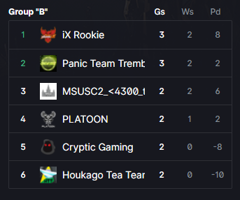 Сегодня в 21:00 состоится матч группового этапа “Platoon vs MSUSC”. Матч будет сыгран по китайскому формату (до 6 побед или до 6 сетов). На данный момент Platoon занимает четвёртое место в группе “Б”, а MSUSC являются лидерами турнирной таблицы четвёртого дивизиона.