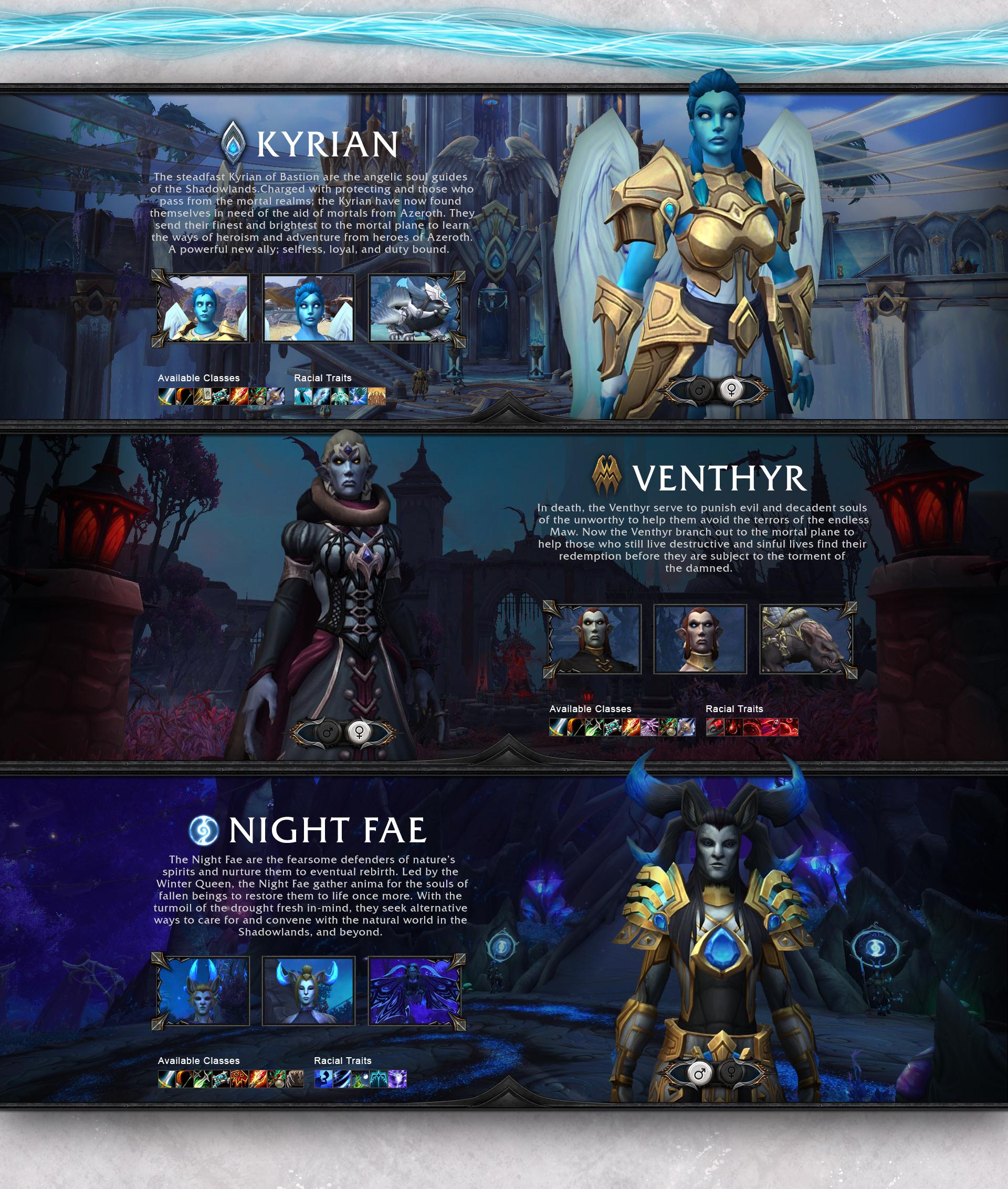 Пользователь Reddit под ником High_King_Chester представил собственный концепт союзных рас в World of Warcraft: Shadowlands. Свое творение он создал на основе ковенантов нового дополнения. Коллаж получился в духе официальных материалов. Сами Blizzard не опровергали, что Темных Землях появятся новые союзные расы.