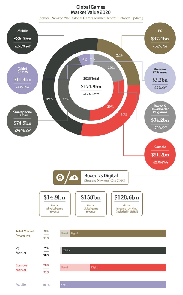 Рынок видеоигр в 2020 году вырос почти на 20% и составил $175 млрд. Об этом сообщил GamesIndustry.biz со ссылкой на исследование Newzoo.