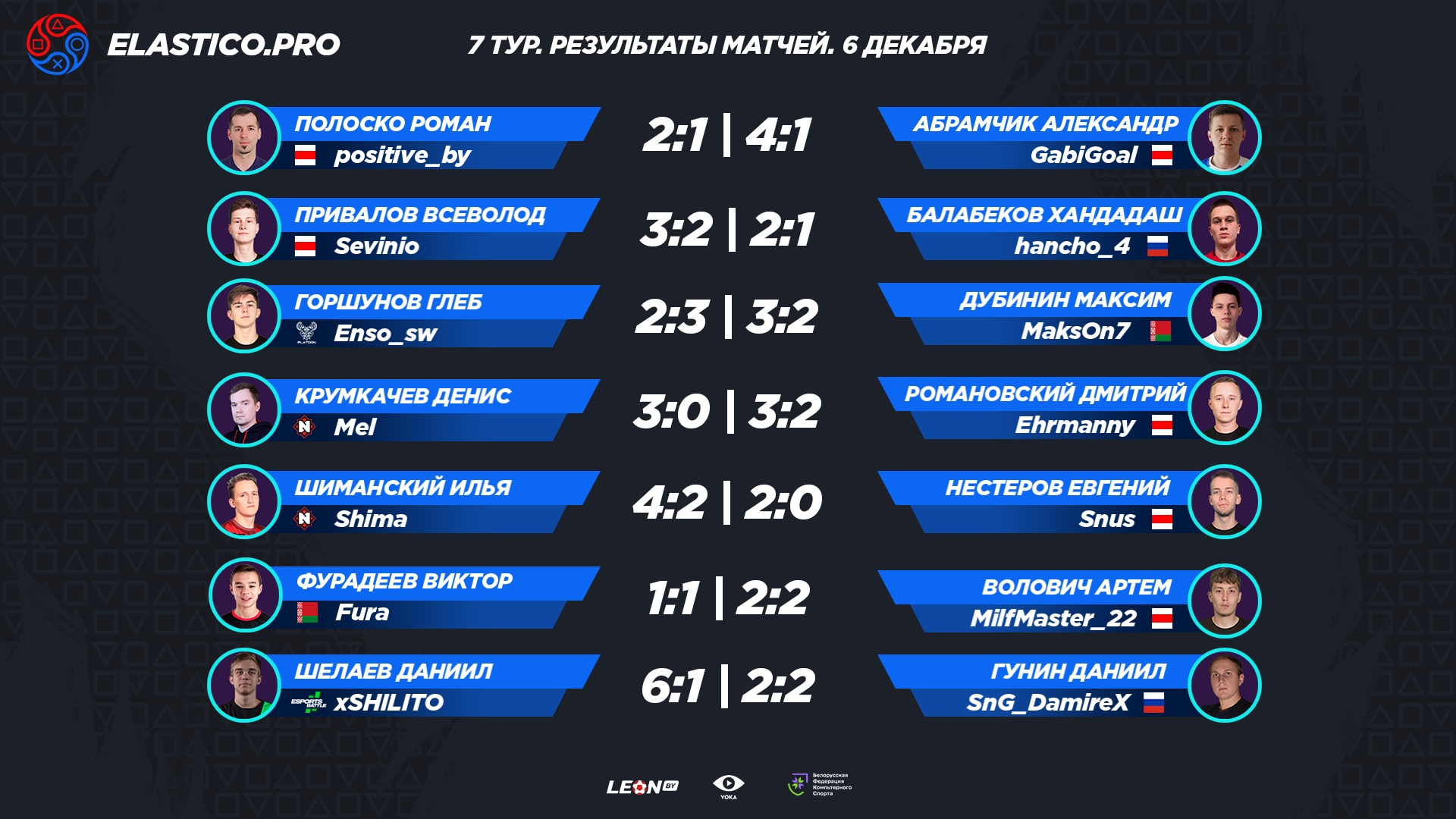 Стали известны результаты седьмого тура PVG Elastico Pro по Fifa 2021. Представитель Nemiga Денис Mel Крумкачёв обыграл Дмитрия Ehrmanny Романовского (3:0, 3:2). Другой представитель “минчан” Илья Shima Шиманский тоже закончил игровой день с двумя победами. Он переиграл Евгения Snus Нестерова (4:2, 2:0). С полным списком результатов можно ознакомиться ниже.