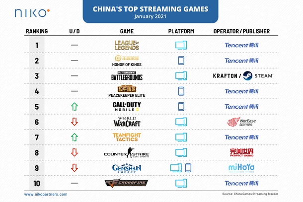 Самой популярной игрой стала League of Legends. Четыре мобильных игры попали в топ-10: Honor of Kings, китайская версия PUBG Mobile, Call of Duty Mobile и Genshin Impact. CS:GO расположилась на восьмой строчке.