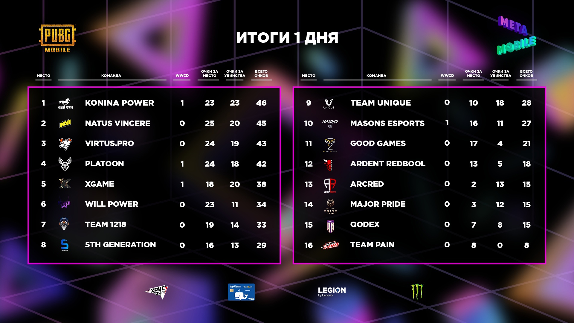 Сегодня проходит заключительный день MЭТА Mobile по дисциплине PUBG Mobile. После первого дня финальной стадии с небольшим отрывом лидировала команда Konina Power, следом за ней расположились Natus Vincere, Virtus.pro и PLATOON.