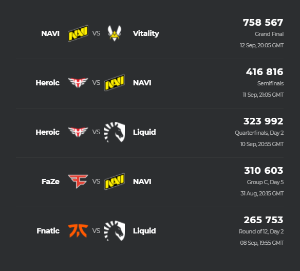 На момент публикации материала пиковый онлайн в матче Sentinels против G2 является лучшим за весь турнир по Valorant. В топ-3 вошел еще один матч этих команд на групповом этапе (808,2 тыс.), а также встреча 100 Thieves и Acend в четвертьфинале (653,9 тыс.).