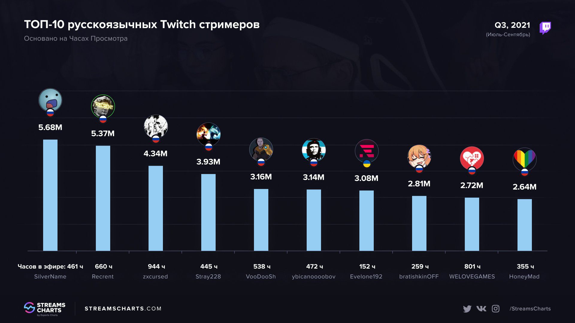 По данным аналитического портала Streams Charts самым популярным русскоязычным стримером в третьем квартале 2021 года стал Владислав SilverName Синотов, представляющий киберспортивный клуб Team Spirit в дисциплине Hearthstone. На протяжении июля, августа и сентября его трансляции набрали 5,68 млн часов просмотра.