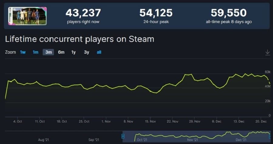 FIFA 22 получилась действительно удачной — в Steam онлайн только растет. Недавний пиковый онлайн составил 59 тысяч человек.