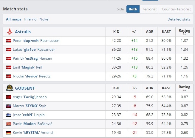 Команда Astralis обыграла GODSENT в четвертьфинале DreamHack Open Fall 2020 по CS:GO. Матч завершился со счетом 2:0 (16:3 на Inferno, 16:10 на Nuke). Таким образом, Astralis вышла в полуфинал, а GODSENT продолжит выступление на чемпионате в нижней сетке плей-офф, где сразится со Sprout.