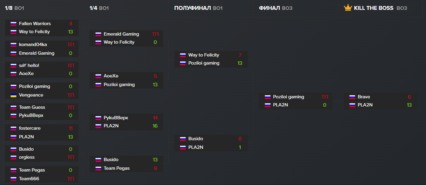 Состав белорусской организации PLATOON по Valorant выиграл российский турнир Kill The Boss | Stage 5 и стал Боссом следующего этапа. В сумме за первое место и победу над Боссом коллектив получил 16.000 российских рублей (примерно 209 долларов). В чемпионате приняло участие 16 команд, организатором выступила киберспортивная площадка G2D.