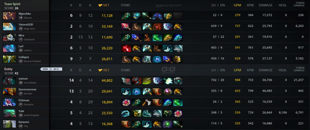 Таким образом, Entity завершила турнир на четвертой строчке, получив $5 тыс. Team Spirit прошла в финал нижней сетки, где 14 февраля сыграет с Gaimin Gladiators (15.00).