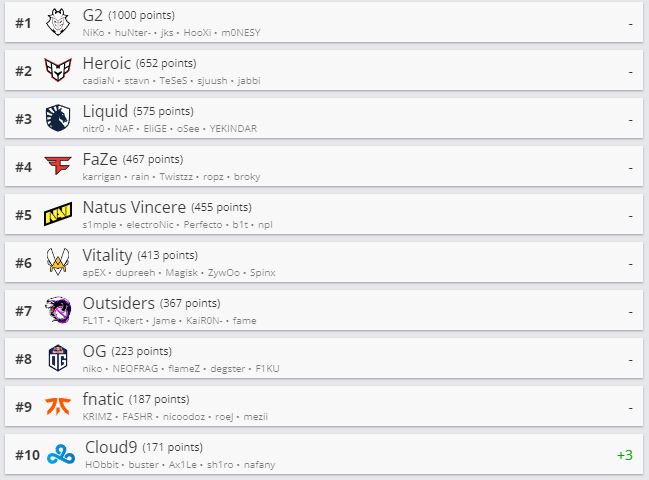 Киберспортивный портал HLTV обновил рейтинг CS:GO-команд. Лидирует в списке по-прежнему G2. Cloud9 вернулась в топ-10 рейтинга. Natus Vincere все еще пятые.